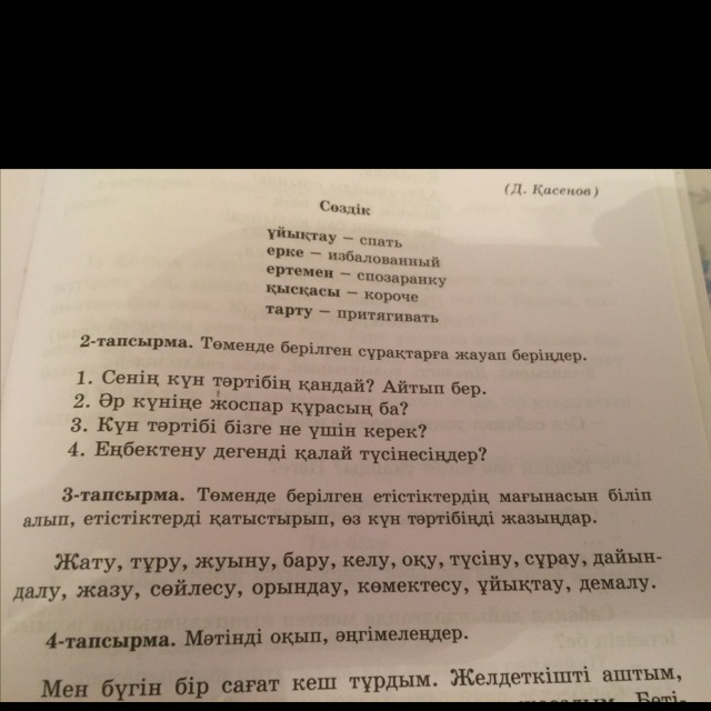 Сағат 1 де сабактан келемін. Келген соң түскі асымды ішіп, оқуымды қайта қайталаймын, сол арқылы дұрыстап түсінемін. Кешке такау мен жазатын жазуларымды жазып, бос уақытымда достарыммен сөйлесемін. Олардың тапсырма ын орындауға көмектесемін. Содан кейін ұйықтап демаламын! Мен осылай күнделікті өмірім өтуде!