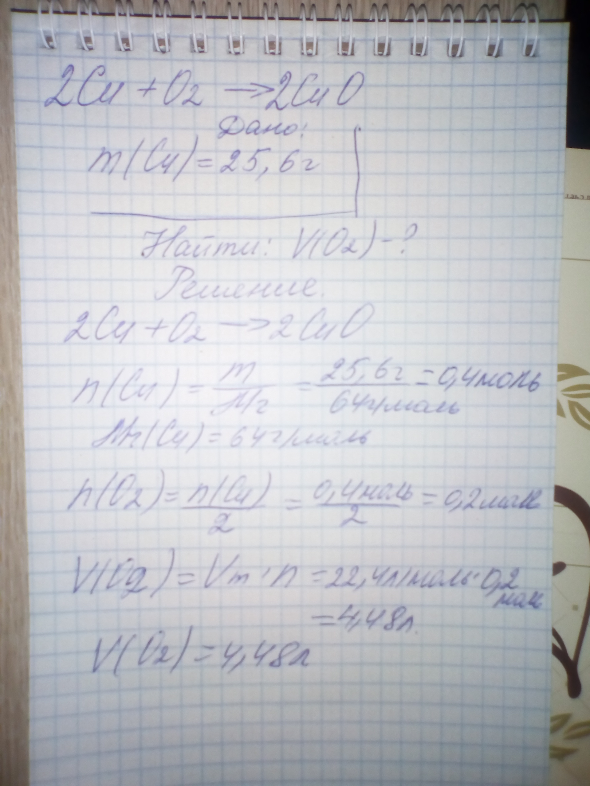 Объем кислорода равен 4,48литра
