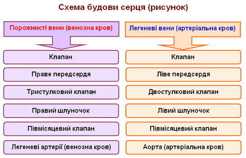 ерце складається з 2 передсердь та 2 шлуночків. Між передсердями та шлуночками є стулкові клапани. Під час скорочення передсердь плином крові клапани відкриваються і пропускають кров у шлуночки. Під час скорочення шлуночків клапани також рухом крові закриваються і не пропускають кров назад до передсердя. На виході аорти з лівого шлуночка , а легеневої артерії з правого розташовані півмісяцеві клапани, які не пропускають кров назад із судин до шлуночків.