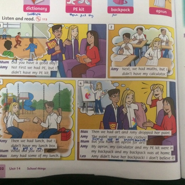Amy: мой калькулятор и мой комплект чтения были в моем рюкзаке, а мой рюкзак был дома.