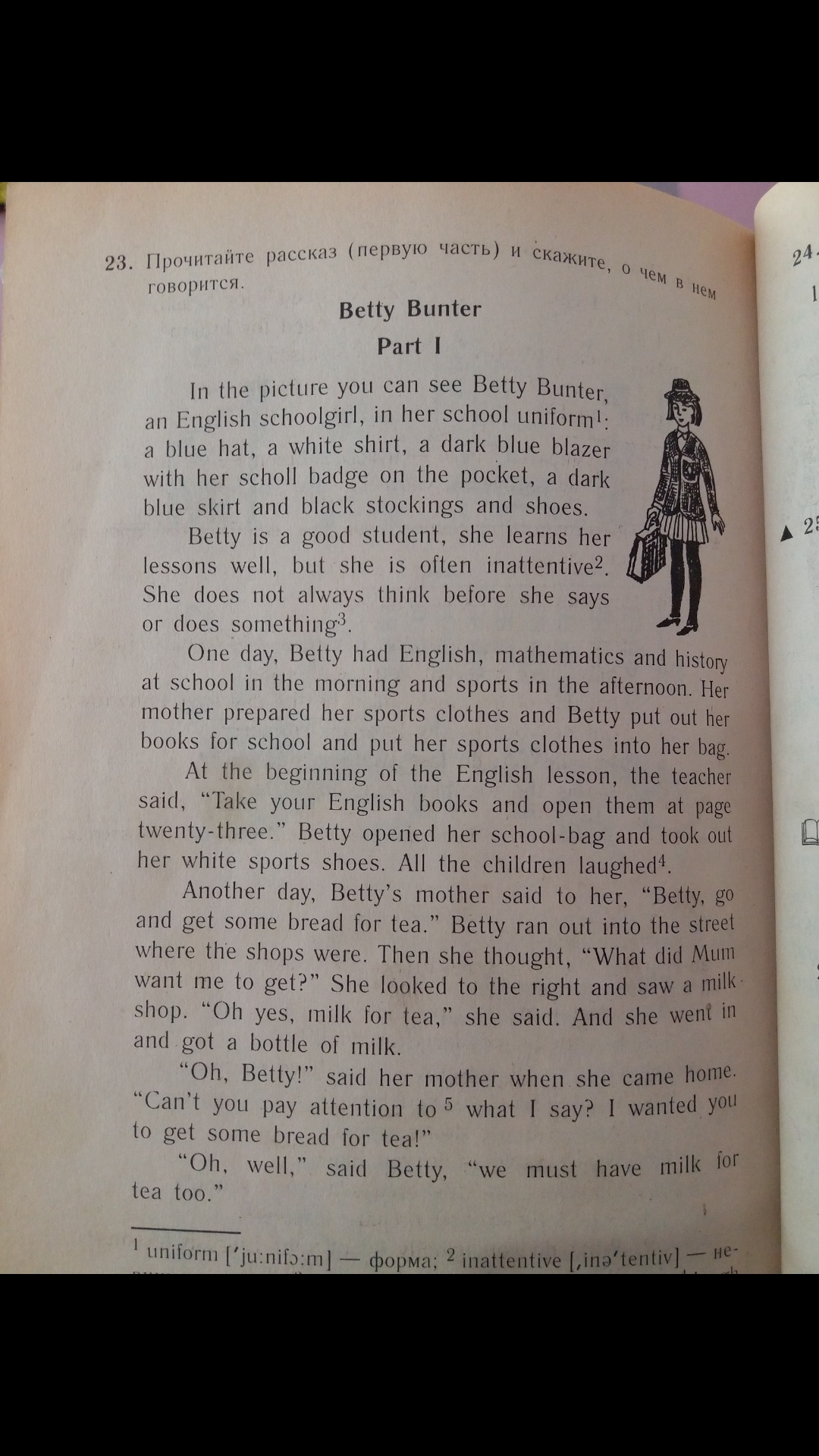 В начале урока английского учитель сказал: "Возьмите свои книги по английскому и откройте их на странице двадцать три". Бетти открыла свой портфель и достала свои белые кроссовки. Все ученики засмеялись.