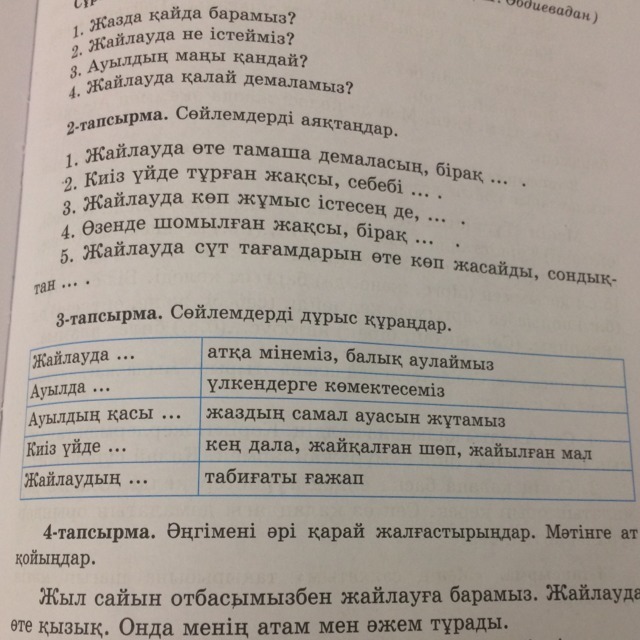 Жайлауда жаздың самал ауасын жұтамыз.Ауылда атқа мінеміз,балық аулаймыз.Ауылдың қасы кең дала,жайқалған шөп,жайылған мал.Киіз үйде үлкендерге көмектесеміз,Жайлаудың табиғаты ғажап.