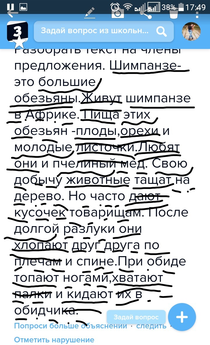 Разобрать текст на члены предложения. Шимпанзе-это большие обезьяны.Живут шимпанзе в Африке. Пища этих обезьян -плоды,орехи и молодые листочки.Любят они и пчелиный мед. Свою добычу животные тащат на дерево. Но часто дают кусочек товарищам. После долгой разлуки они хлопают друг друга по плечам и спине.При обиде топают ногами,хватают палки и кидают их в обидчика.