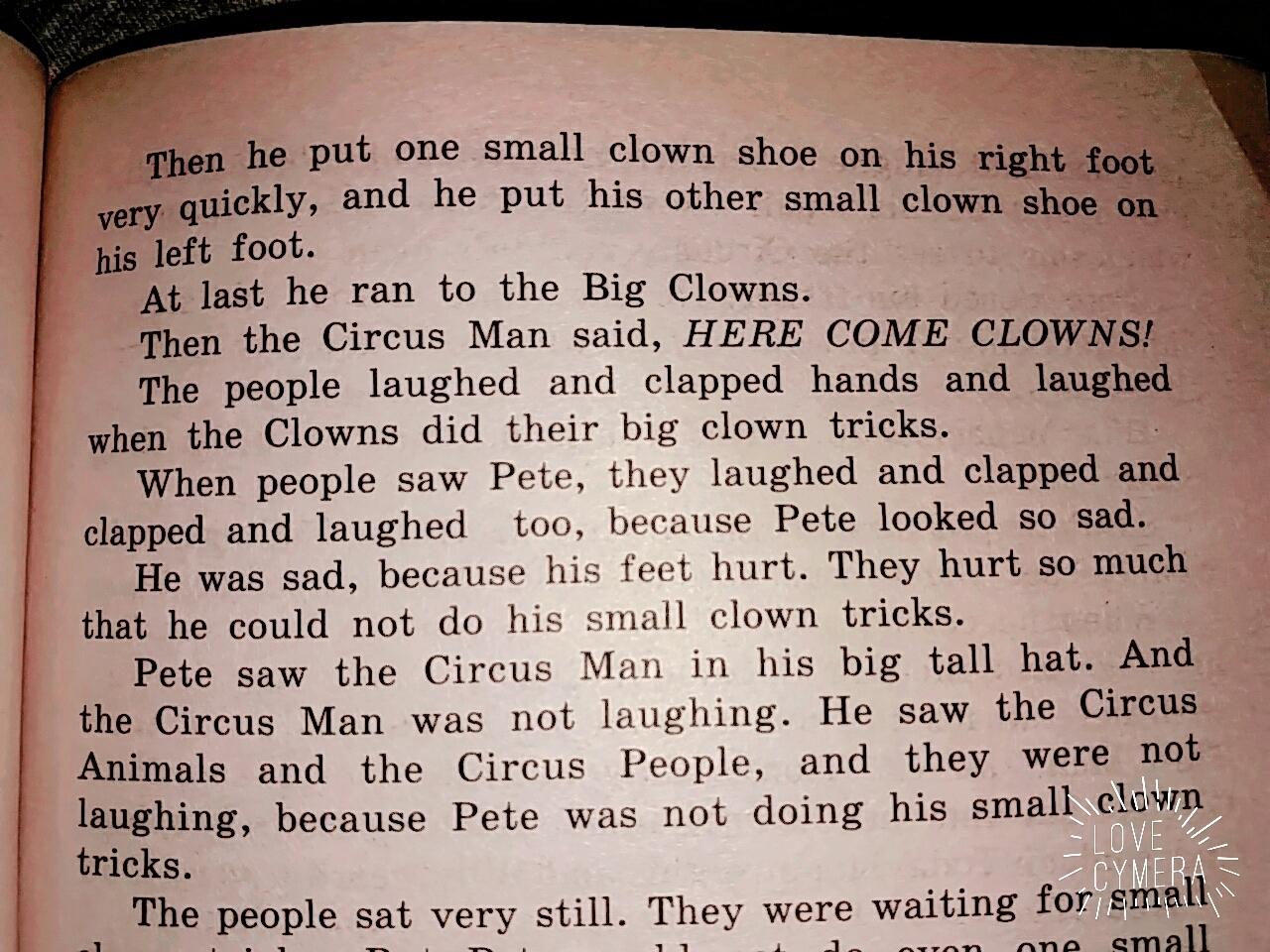 Но Циркач в большой, продолговатой шляпе не выронил ни слова. Он не поздравил Пита с днем его рождения. Он открыл рот и промолвил, "Ты не можешь быть клоуном. Ты лишком мал. Ты ведь даже не можешь делать трюки клоунов!"