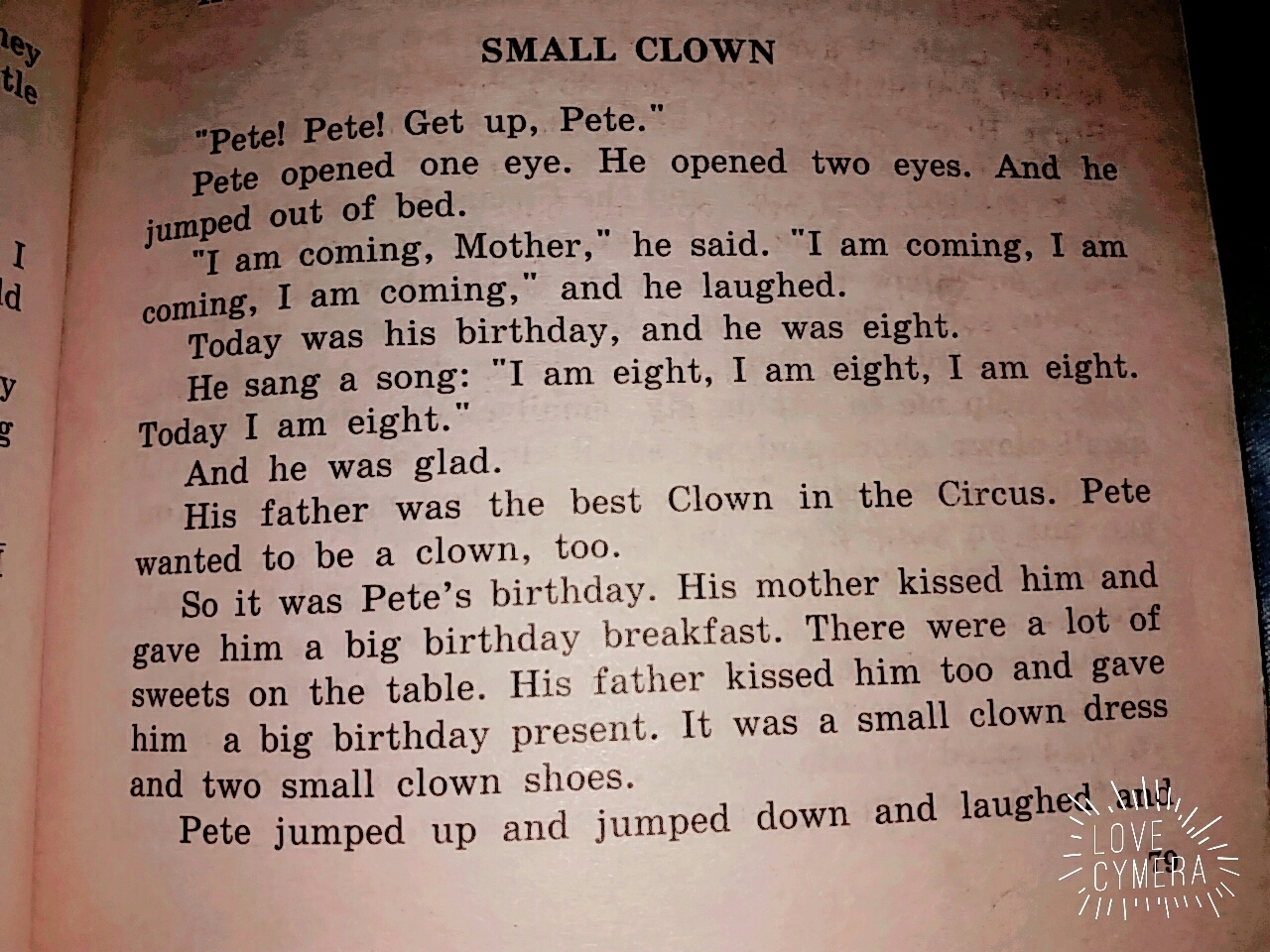 Итак, это день рождения Пита. Его матушка поцеловала его и дала ему большой завтрак на день рождения. На столе лежало множество сладостей. Его отец тоже его поцеловал и вручил ему большой подарок в честь дня рождения. Это были костюм клоуна и два маленьких клоунских сопога.