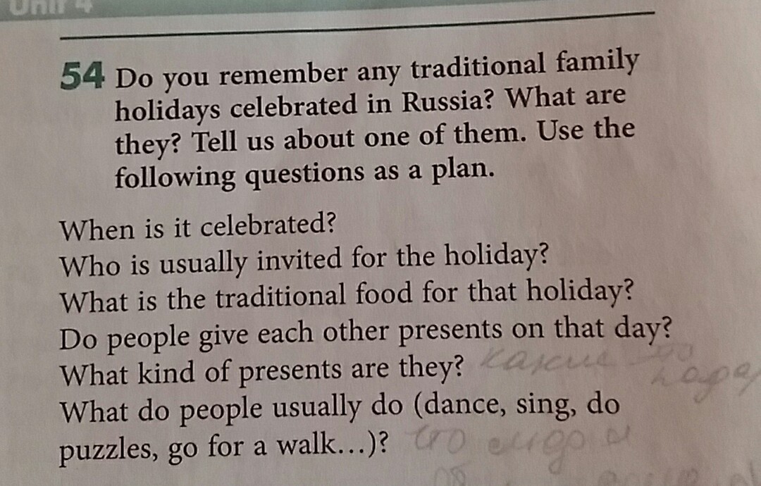 In Russian, we have a party to celebrate our birthdays. Everyone brings a gift. My mum always makes me a birthday cake. We have a table full of food, sandwiches, salads, fish, chicken, meat, fruit, ice cream, sweets and lemonade.