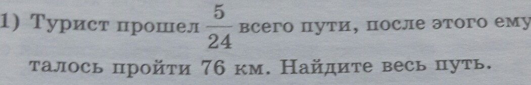 турист прошёл 5/24 всего пути,после этого ему осталось пройти 76 км. найдите весь путь