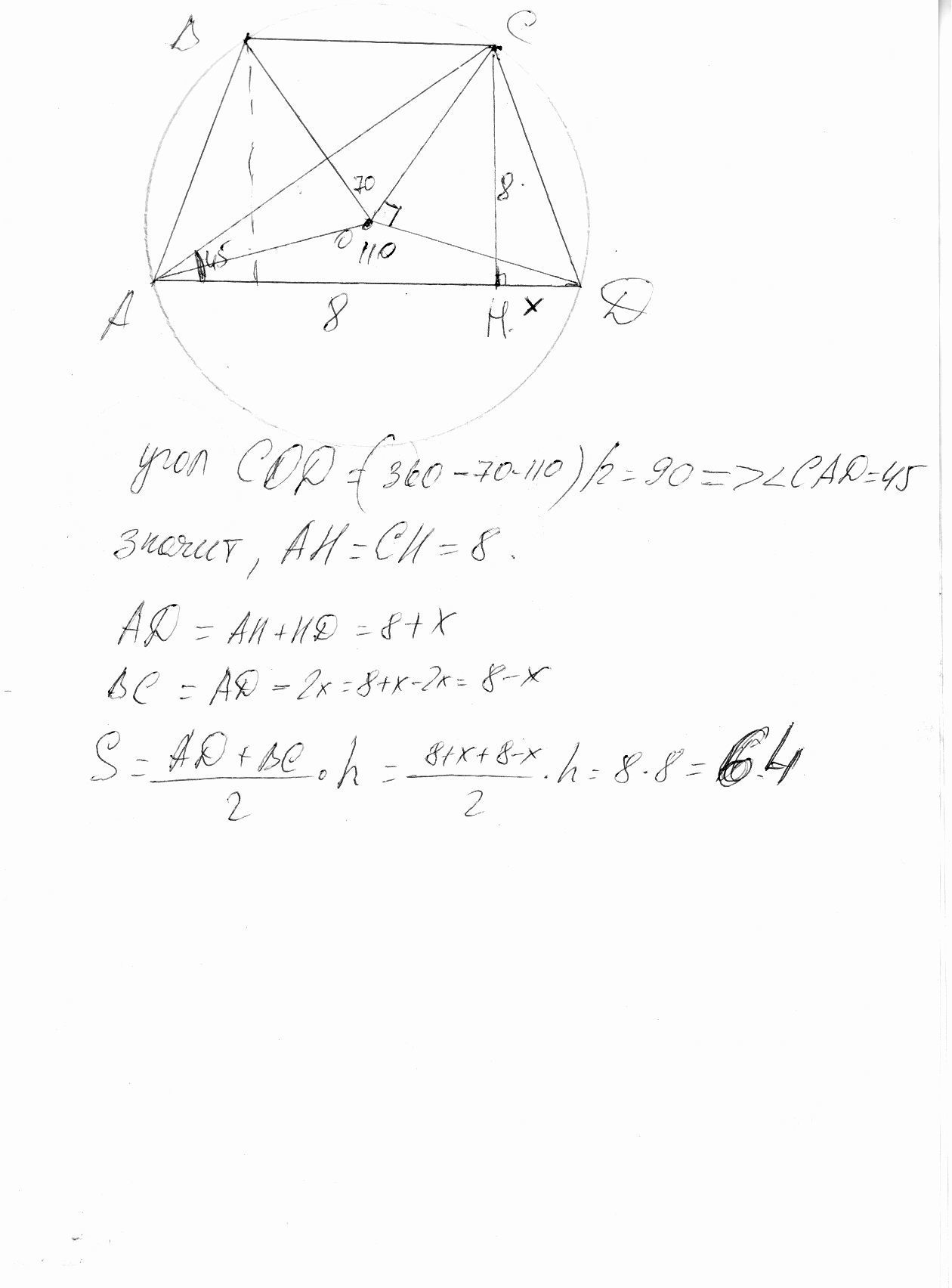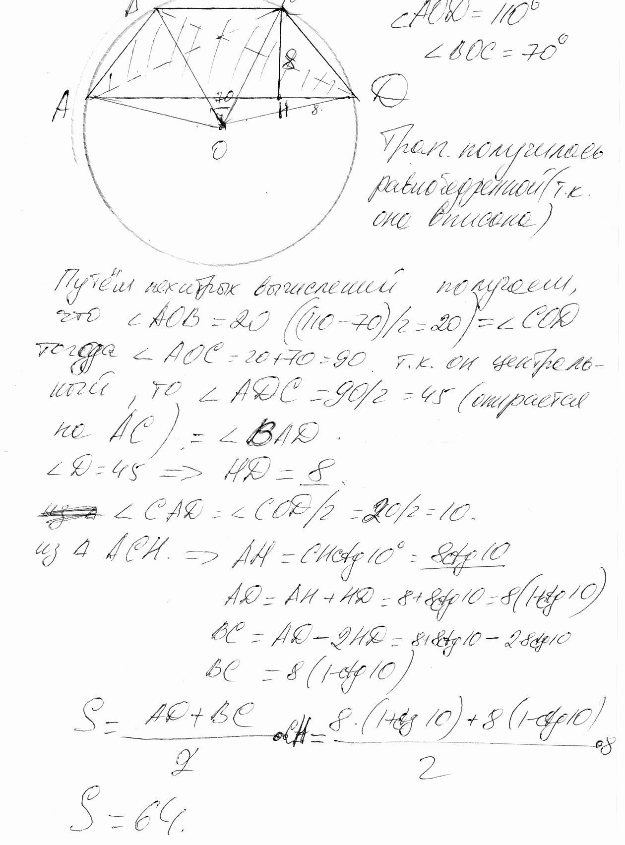 около трапеции с высотой равной 8 описана окружность центр которой лежит внутри трапеции большее основание трапеции видно из центра окружности под углом 110 а меньшее подуглом 70 найдите площадь трапеии