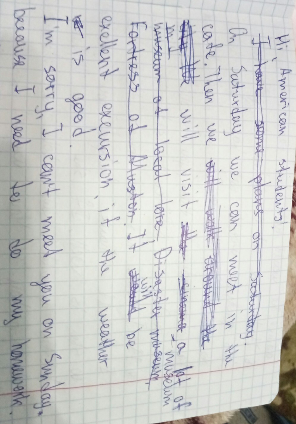 Привет,... Мы можем встретится в субботу в кафе. Дальше мы посетим много музеев. Это будет замечательная экскурсия, если погода будет хорошая. Мне жаль, я не могу встретится с тобой в воскресенье, потому что мне надо делать уроки.