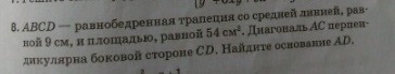 abcd равнобедренная трапеция со средней линией = 9см и площадью 54. диагональ ac перпендикулярна боковой стороне. найдите ad