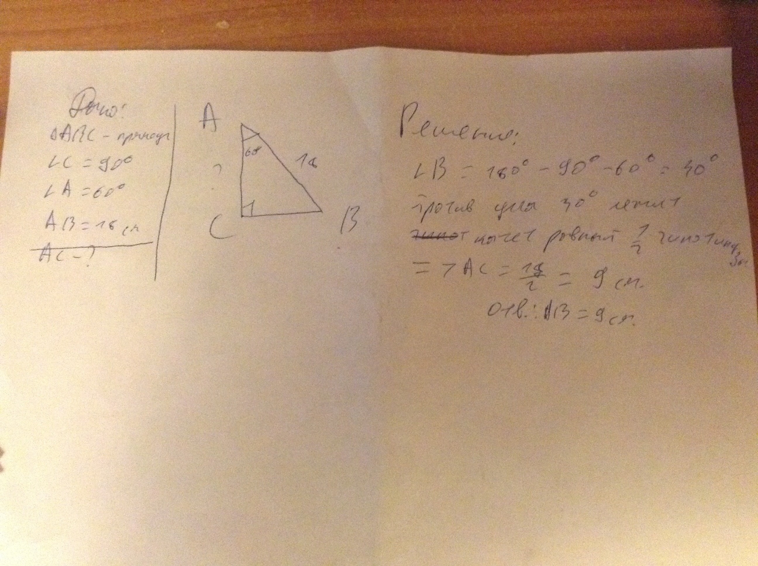 В треугольнике ABC ∠С = 90°, ∠A = 60°, AB = 18см. Найдите AC.