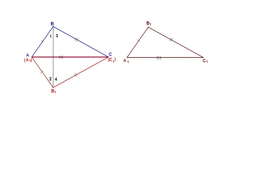 Доказательство. Построим треугольник А₁В₁С₁, совместив равные стороны АС и А₁С₁ данных треугольников как на рисунке, так, чтобы вершины В и В₁ оказались по разные стороны от прямой АС.