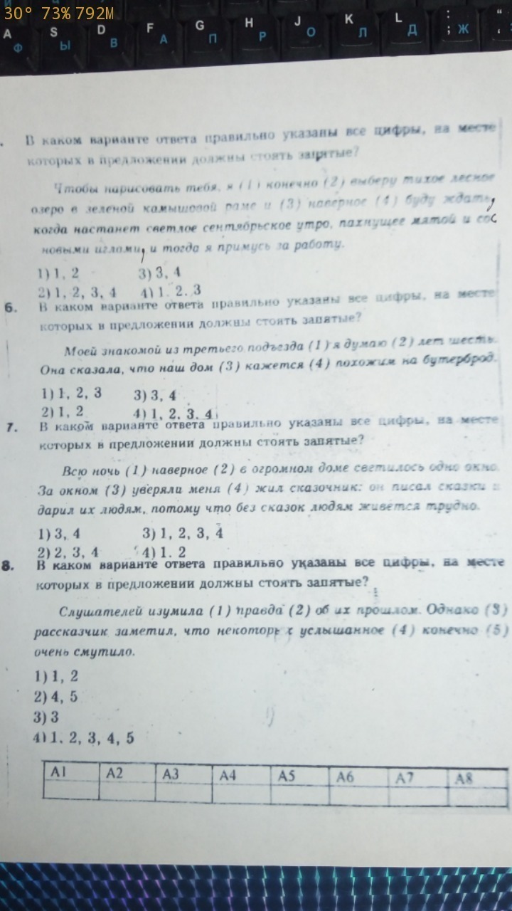 во-вторых, в 7 задании "За окном жил (1)уверяли меня(2) сказочник" будут запятые, иначе смысл предложения неправильным будет.