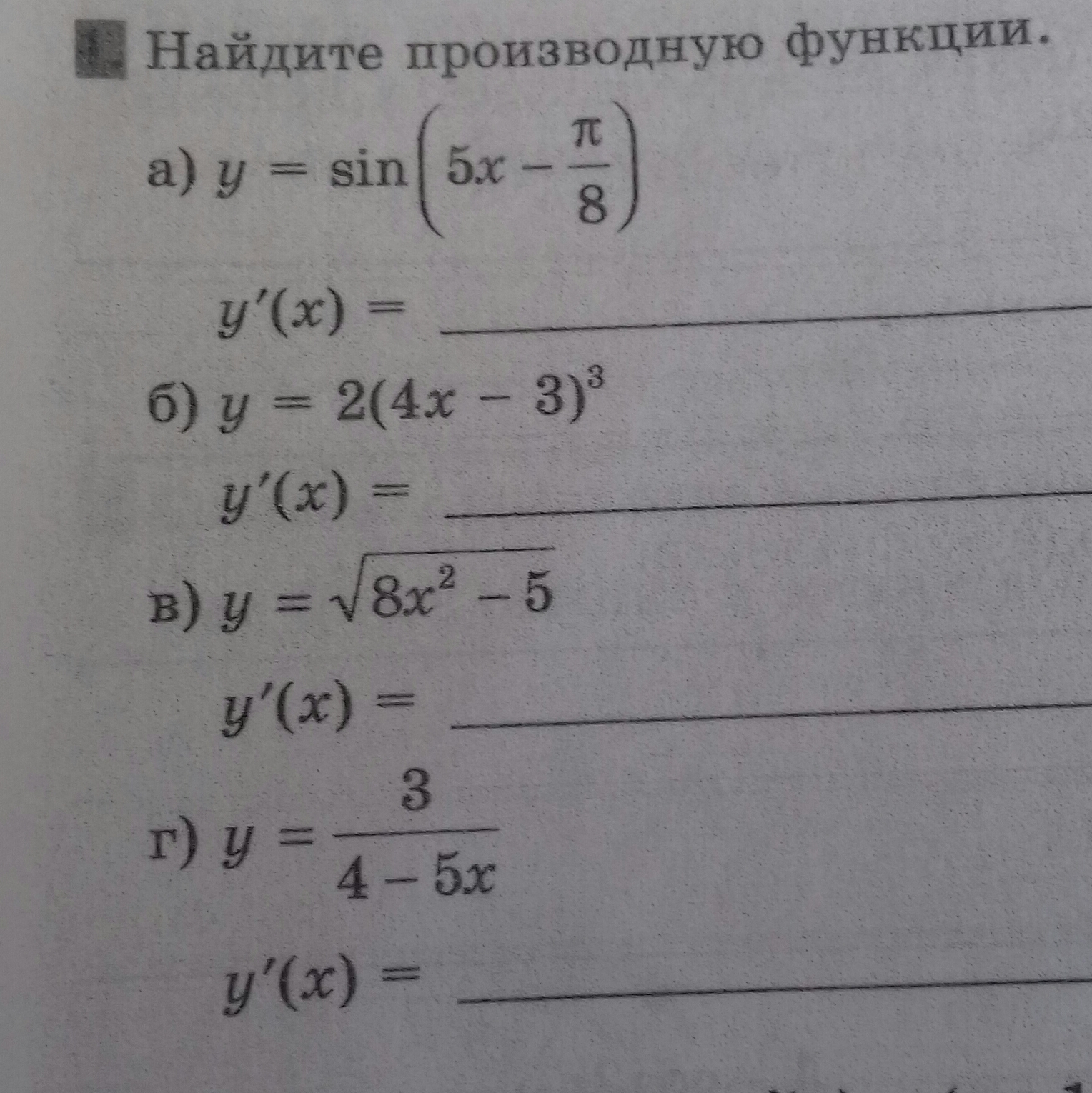 1); ; y=sin(5x-frac{pi}{8}); ,; ; y'=5cdot cos(5x-frac{pi}{8})\\2); ; y=2(4x-3)^3; ,; ; y'=2cdot 3(4x-3)^2cdot 4=24cdot (4x-3)^2\\3); ; y= sqrt{8x^2-5}\\y'=frac{1}{2sqrt{8x^2-5}} cdot  16x= frac{8x}{sqrt{8x^2-5}} \\4); ; y= frac{3}{4-5x} \\y'= frac{-3cdot (-5)}{(4-5x)^2} = frac{15}{(4-5x)^2}