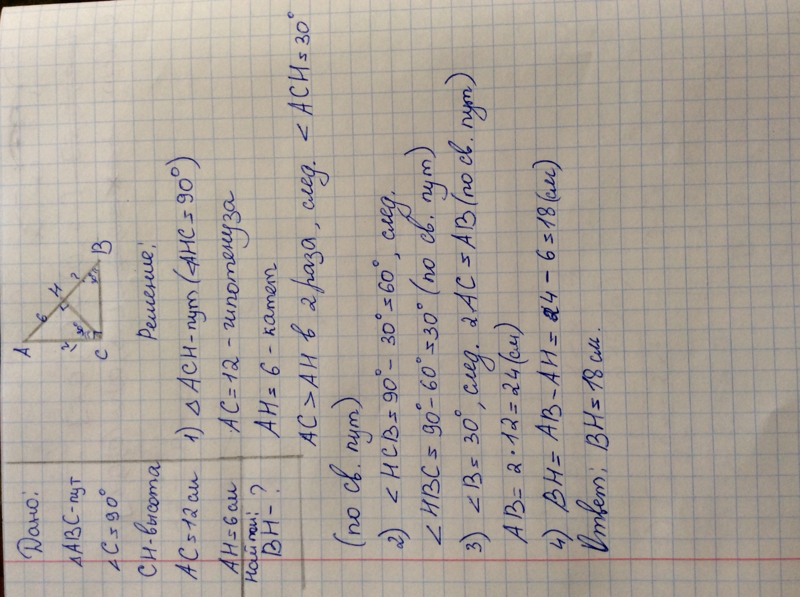 В прямоугольном ∆ABC(С= 90) проведена высота СН. Найдите ВН, если АС=12 см, АН = 6 см.