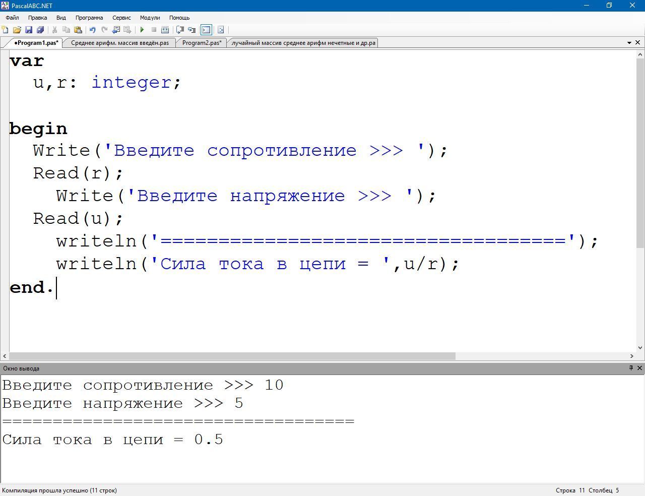 составьте программу для вычисления величины силы тока на участке электрической цепи с сопростивлением R ом при напряжении