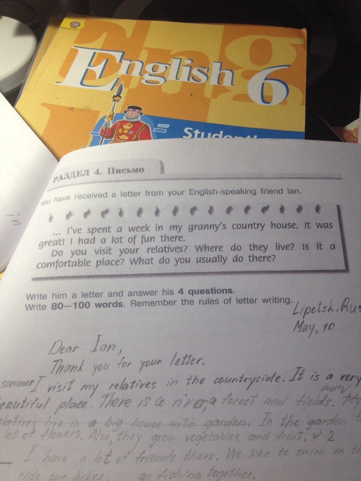 Thank you for your letter. I received yesterday. Wow, it is great that you have spent a week in your granny`s country house and had a lot of fun there.