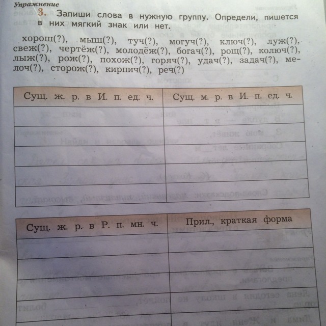 Хорош, мышь, туч, могуч, ключ, луж, свеж, чертёж, молодежь, богач, рощ, колюч, лыж, рож, похож, горяч, удач, задач, мелочь, сторож, кирпич, речь.