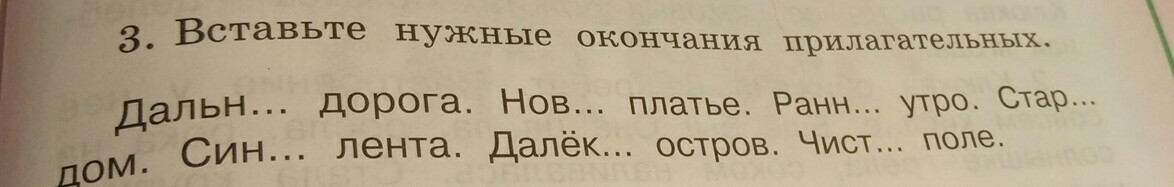 Дальняя дорога (ж. р); новое платье (ср. р); раннее утро(ср. р); старый дом (м. р); синяя лента (ж. р); далекий остров (м. р); чистое поле (ср,р)