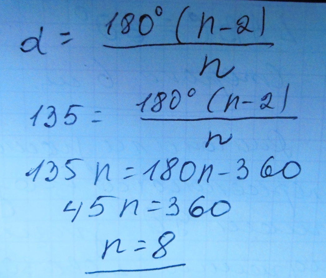 ((n-2) * 180)/ n = 135180n - 360 = 135n45 n = 360n = 8, значит это восьмиугольник, то есть 8 сторон