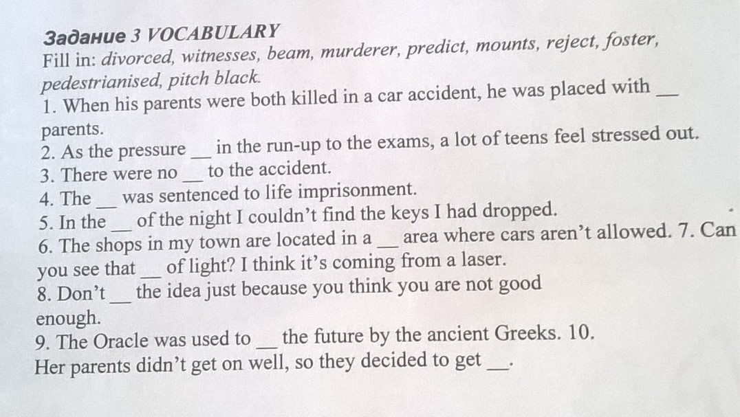 1 foster 2 mounts 3 witnesses 4 murderer 5 pitch black 6 pedestrianised 7 beam 8 reject 9 predict 10 divorced