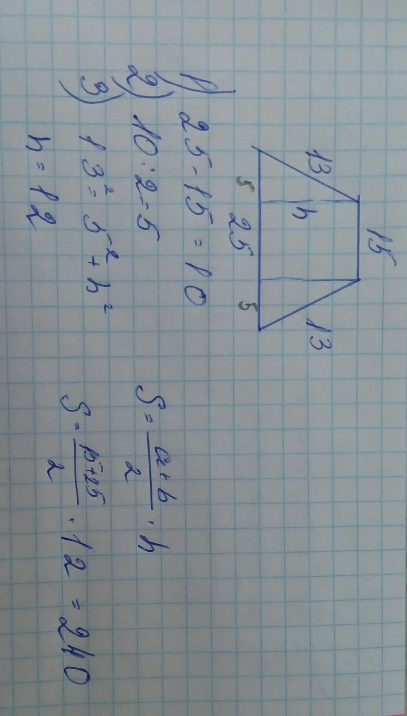 основы равнобедренной трапеции равны 25 см и 15 см.а боковая сторона -13см найдите площадь трапеции