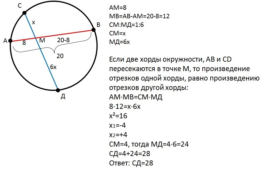 ПОМОГИТЕ !!!!!!! Точка М является точкой пересечения хорд АВ и СД. АМ=8 см, АВ=20 см, СМ : МД=1 : 6. Найти: СД Никак не могу решить.