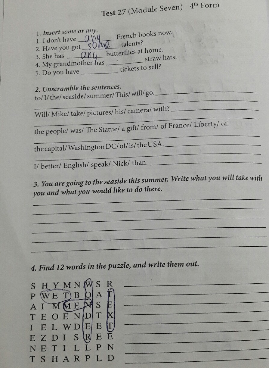 3 I`m going to the seaside this summer and will take sunglasses, the sun block, a ball and some fruit with water. I would like to sunbathe and swim in the sea there.