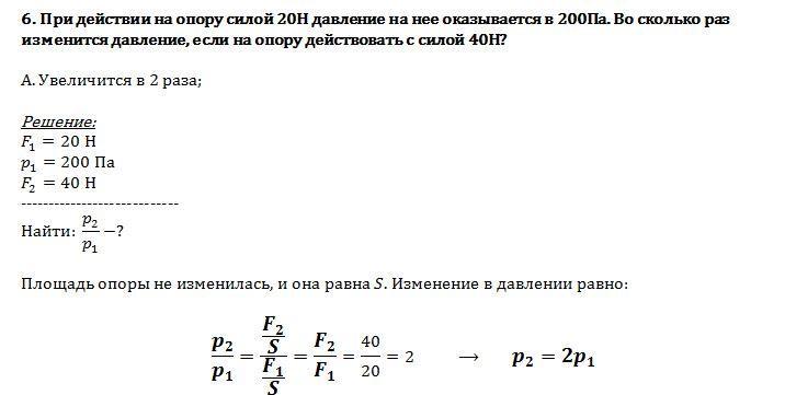 При действии на опору силой 20Н давление на нее оказывается в 200Па. Во сколько раз изменится давление, если на опору действовать с силой 40Н?
