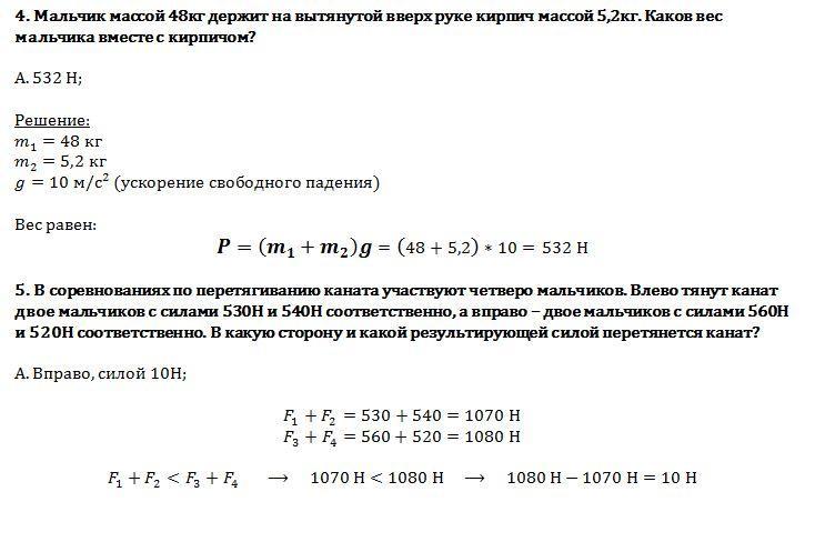 Мальчик массой 48кг держит на вытянутой вверх руке кирпич массой 5,2кг. Каков вес мальчика вместе с кирпичом?
