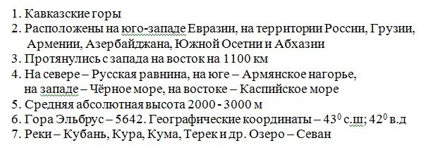 1.Называем горы. (Кавказкие Горы). Найдем их на карте и определим, на каком материке, в какой его части и в какой стране они находятся.