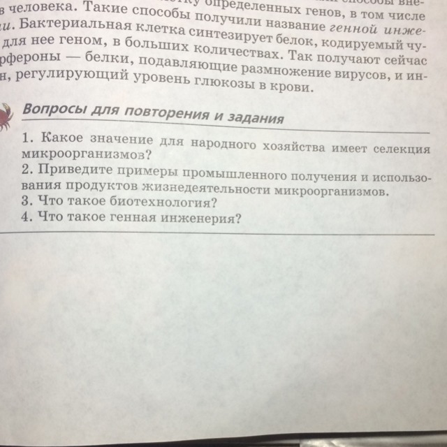 Таковы примеры, использования микроорганизмов в промышленных отраслях весьма разнообразно. В хлебопечении, все виды дрожжевого теста изготавливаются при помощи дрожжевых грибов. В приготовлении молочно-кислых продуктов используют кефирного или йогуртового грибка. В медицине - получение гормона инсулина и белка интерферона за счёт внедрения генов этих белков в хромосому кишечной палочки.