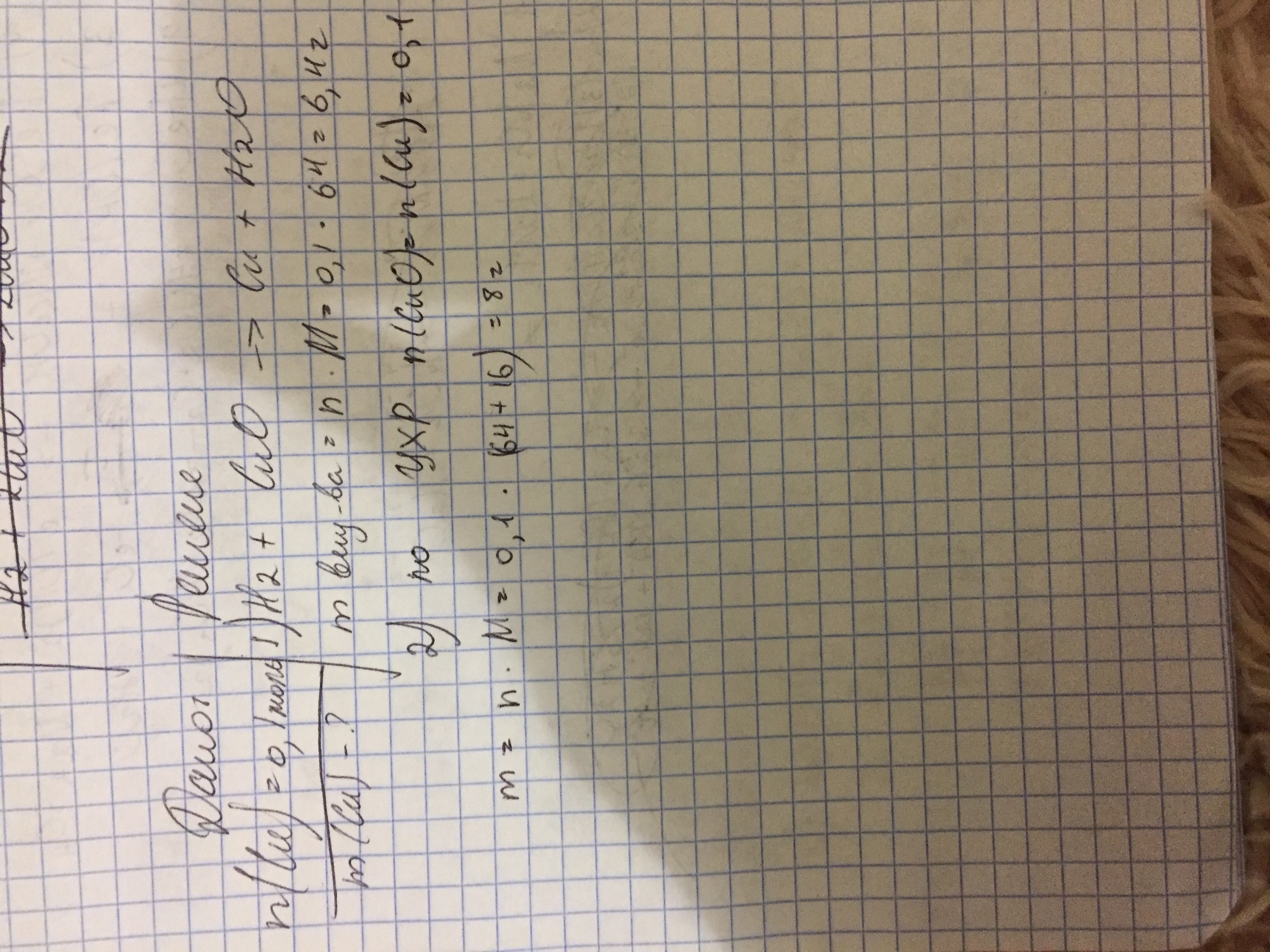 При взаимодействии водорода с оксидом меди(II) образовалось 0,1 моль меди. Вычислите а) массу образовавшейся меди; б) массу и количество вещества оксида меди(II), вступившего в реакцию
