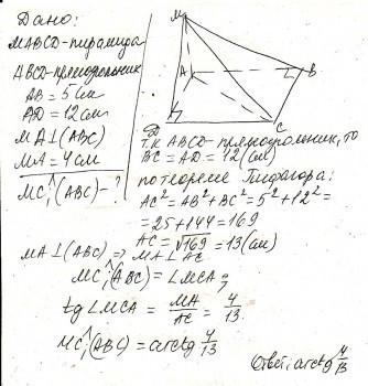 Основанием пирамиды МАВСD является прямоугольник АВСD со сторонами АВ = 5 см и AD = 12 см. Боковое ребро МА перпендикулярно к плоскости основания пирамиды и равно 4 см. Найти угол наклона ребра МС к плоскости ABCD. *б) Постройте сечение пирамиды плоскостью, параллельной плоскости основания и проходящей через точку F на ребре МА, MF : FA = 1 : 3. Найдите площадь сечения.