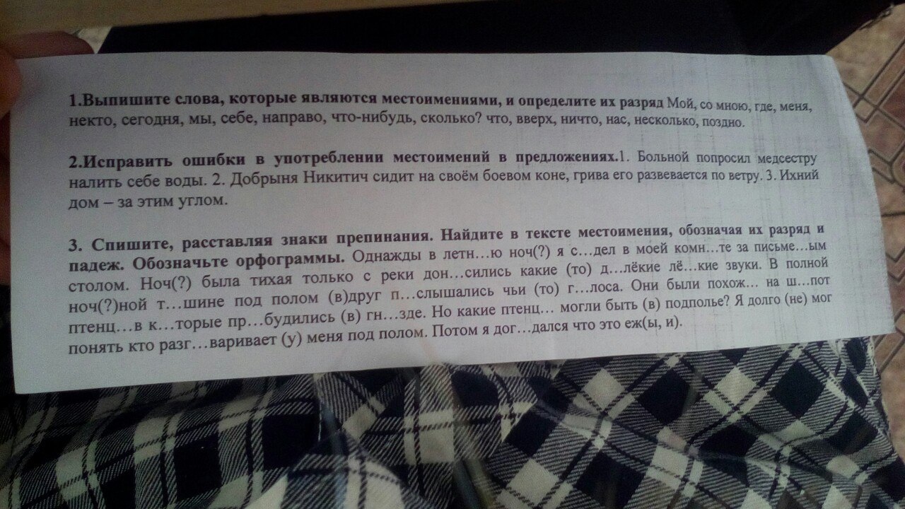 Однажды в летнюю ночь я(личное,И.п.) сидел в моей(притяжательное,П.п.) комнате за письменным столом. Ночь была тихая,только с реки доносились какие-то(неопределенное,И.п.) далёкие лёгкие звуки. В полной ночной тишине под полом вдруг послышались чьи-то(неопределенное,И.п.) голоса.Они(личное,И.п.) были похожи на шёпот птенцов,которые пробудились в гнезде. Но какие(вопросительное,И.п.) птенцы могли быть в подполье?Я(личное,И.п.) долго не мог понять,кто(вопросительное,И.п.) разговаривает у меня(личное,Р.п.) под полом. Потом я(личное,И.п.) догадался,что(относительное,И.п.) это ежи.