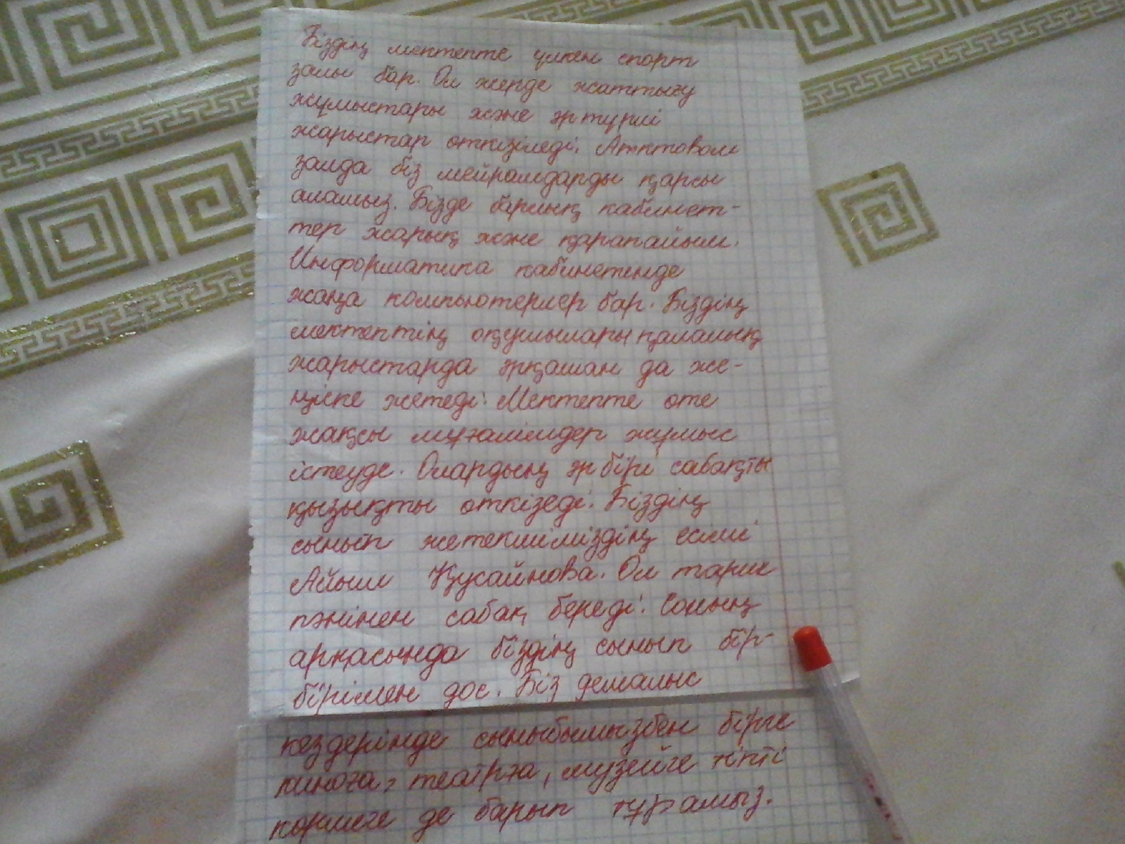 В нашей школе есть большой спортивный зал. В нём проходят уроки физкультуры и разные спортивные соревнования. В актовом зале мы встречаем праздники. Все кабинеты у нас светлые и просторные. В кабинете информатики стоят новые компьютеры. Ученики нашей школы часто побеждают в городских олимпиадах. В школе работают очень хорошие учителя. Каждый из них всегда интересно проводит урок. Нашего классного руководителя зовут Айим Кусайновна. Она преподаёт историю. Благодаря ей наш класс самый дружный. Мы часто всем классом на выходных ходим в кино, театры, музеи и на выставки.