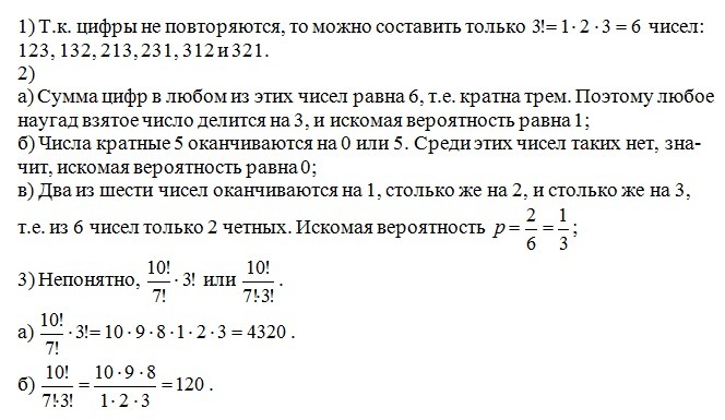 1) Сколько трёхзначных чисел можно составить из цифр 1, 2, 3, если цифры в записи числа не повторяются.