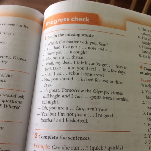 am feeling bad; a runny nose and a sore throat; got a cough; a sore throat; you’ve got flu; take medicines and you’ll feel better; go to school; you should stay in bed; I can watch sports; a sports fan; a fan, I’m good at football