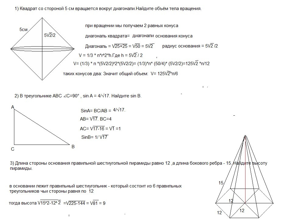 1) Квадрат со стороной 5 см вращается вокруг диагонали.Найдите объём тела вращения.