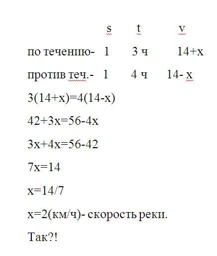 На путь по течению реки катер затратив 3 часа а на обратный 4. Какова скорость течения реки если собственная скорость катера 14 к м в ч