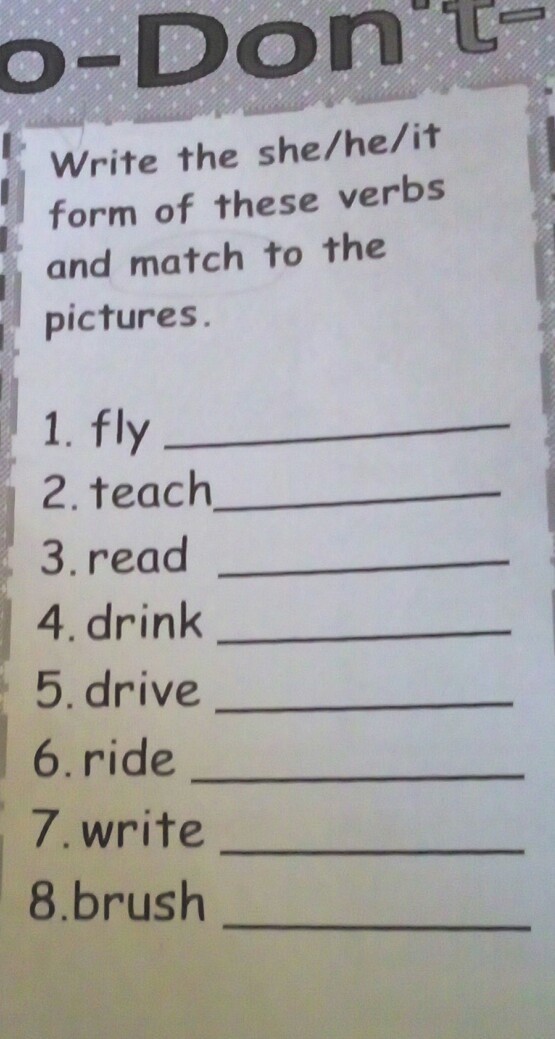 1 flies 2 teaches 3 reads 4 drinks 5 drives 6 writes 7 brushes - для форм it she is