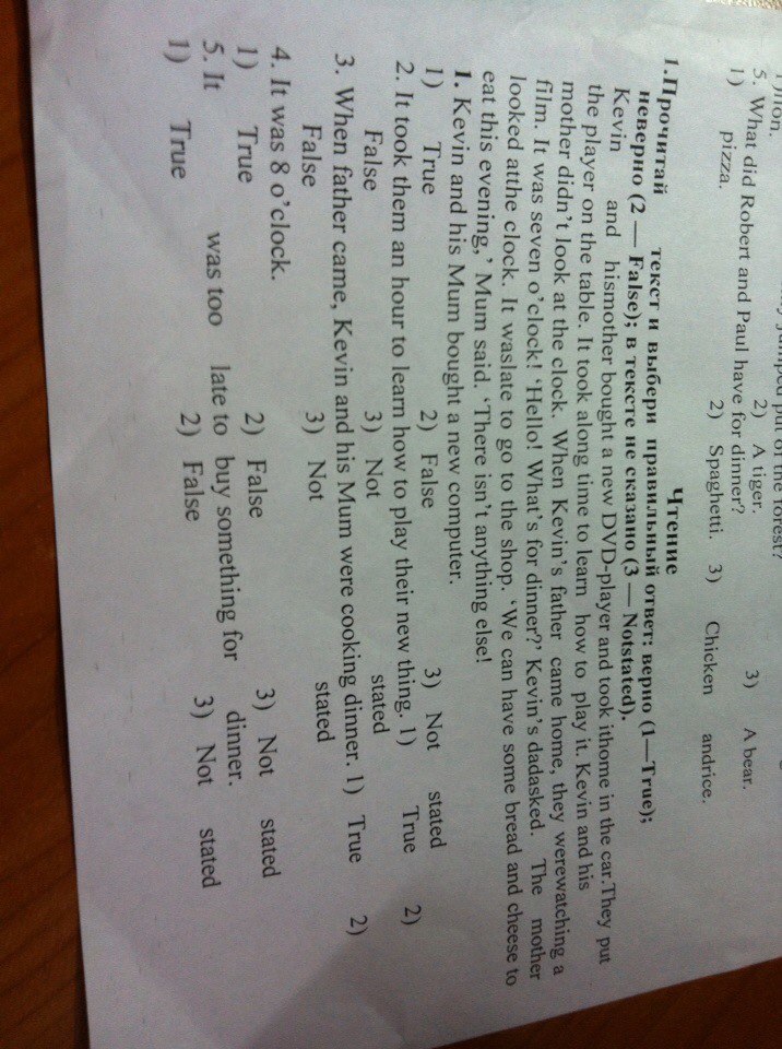 1:2 False (they bought a DVD-player 2:3 N/S (a long time) 3:2 F (they were watching a film) 4:2 F (it was seven o’clock) 5:1 T
