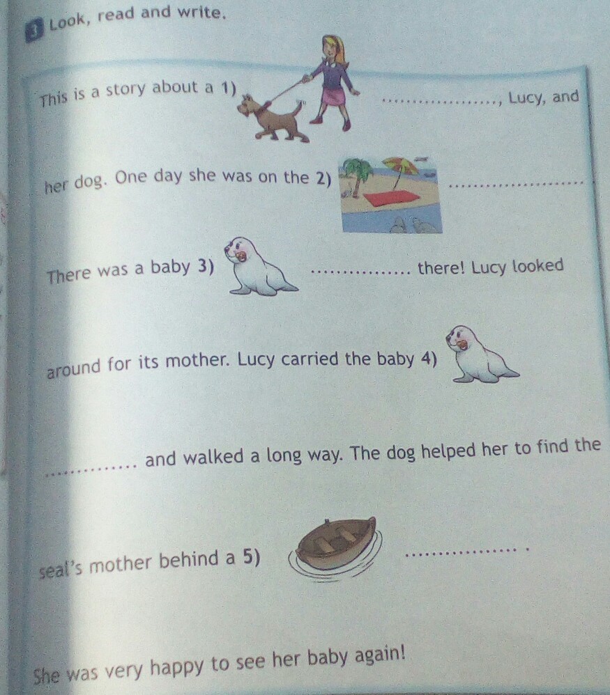 1 a girl 2. Beach 3. Seal 4. Seal 5. Boat