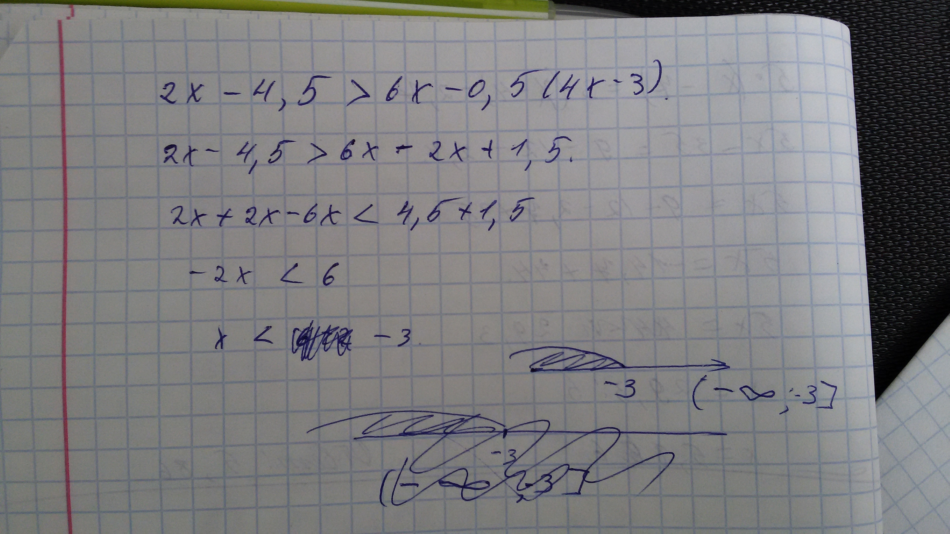 Держи. Прости, что начеркала. Знак неравенства меняется т.к. число, переносимое в правую сторону, отрицательное. только я точно не вспомню меняется ли он уже на третьем действии или на четвертом. Но и в том и в другом случае ответ будет таким )