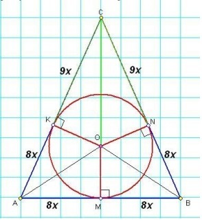 ОМ - радиус вписанной окружности, КА=АМ=NB=MB=8x, KC=CN=9x.