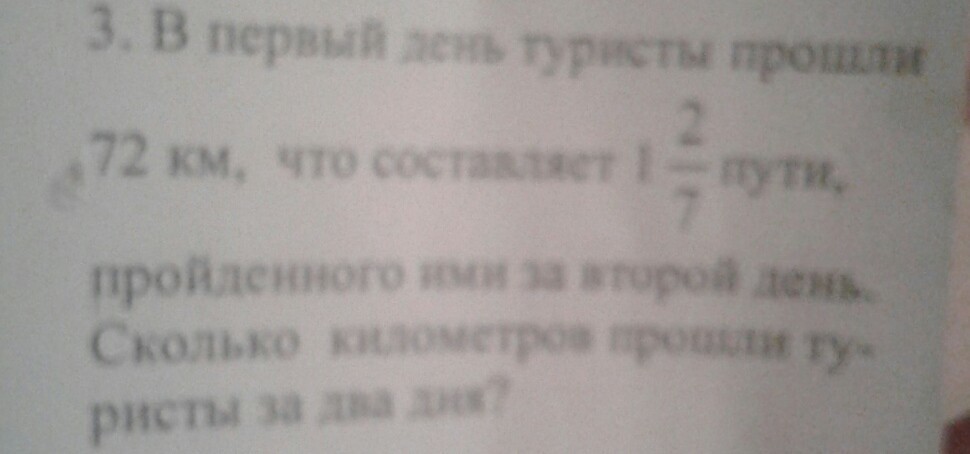 в первый день туристы прошли 72 км что составляет 1 целых 2/7 пути Родина Ваенга второй день сколько километров прошли Туристы за два дня