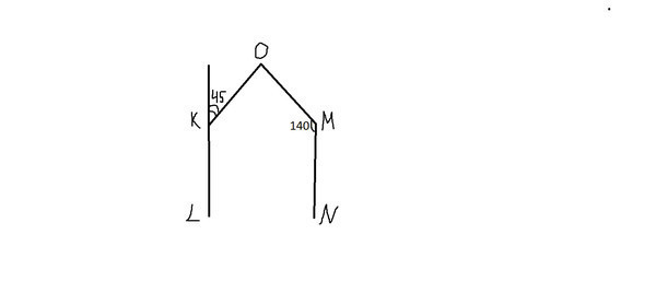 Надо продлить прямую МО до пересечения с прямой LK в точке, например, Р. Тогда угол КРО будет равен 180°-140°=40° как внутренний односторонний при параллельных прямых KL и MN и секущей МР. Угол КОМ - внешний угол треугольника КРО и равен сумме двух внутренних, не смежных с ним. То есть угол КОМ равен сумме углов РКО и КРО или равен 40°+45°=85°. Это ответ.