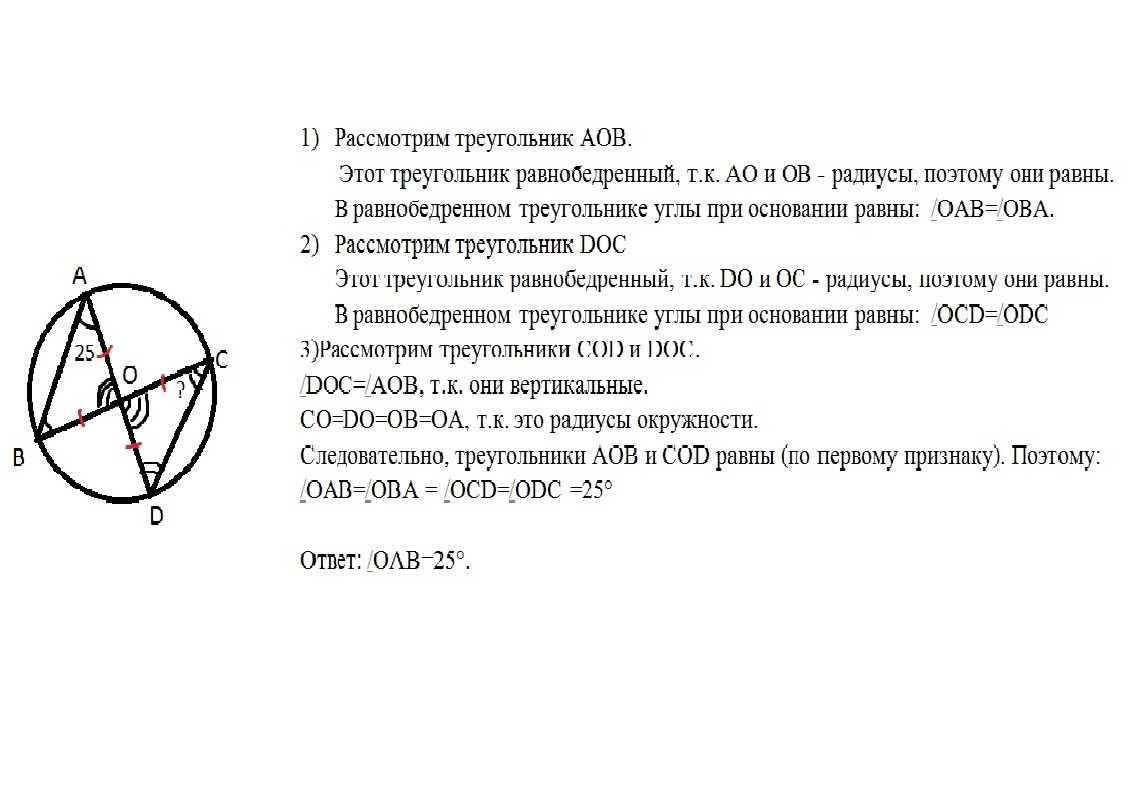 В окружности с центром в точке О проведены диаметры АD и ВС , угол ОАВ равен 25°. Найдите велечину угол ОСD