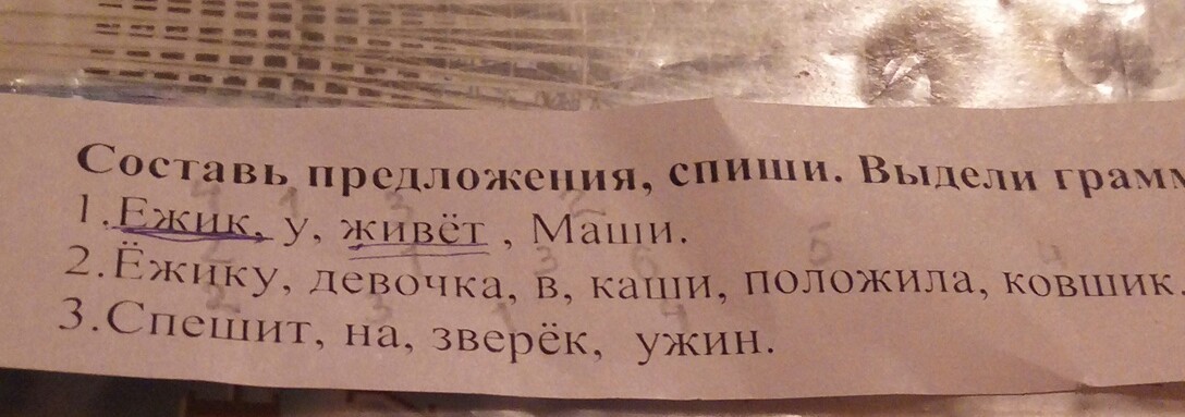 предложения: ёжик живёт у маши. девочка в ковшик каши ёжику положила зверёк спешит на ужин