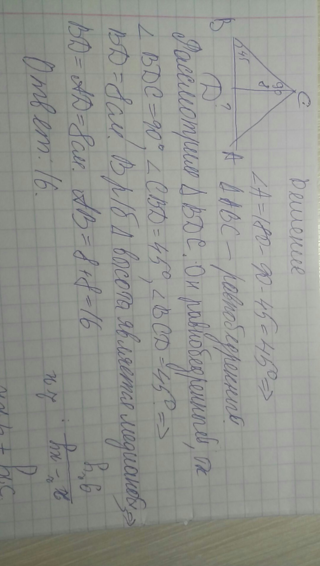 В треугольнике АСВ, угол С= 90°, угол В=45, проведена высота СД=8 см, найти гипотенузу АВ